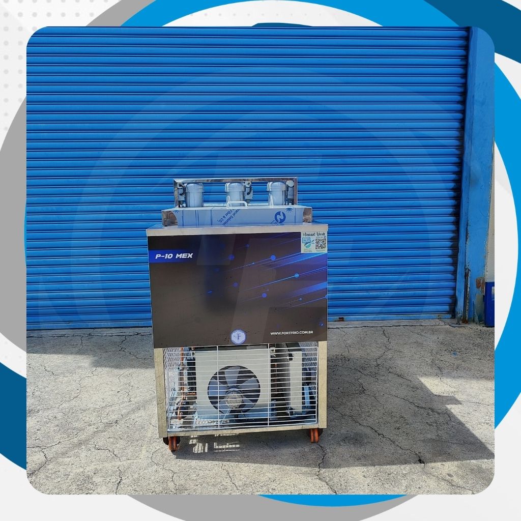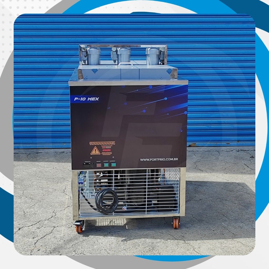 The machine features a churning system that agitates the liquid, enhancing the cooling of the molds in a shorter time. It has the capacity for 8 molds with 26 cavities each or 12 molds with 22, 24, or 28 cavities for making popsicles. Please check with FORTFRIO for the permitted models before purchasing the equipment.